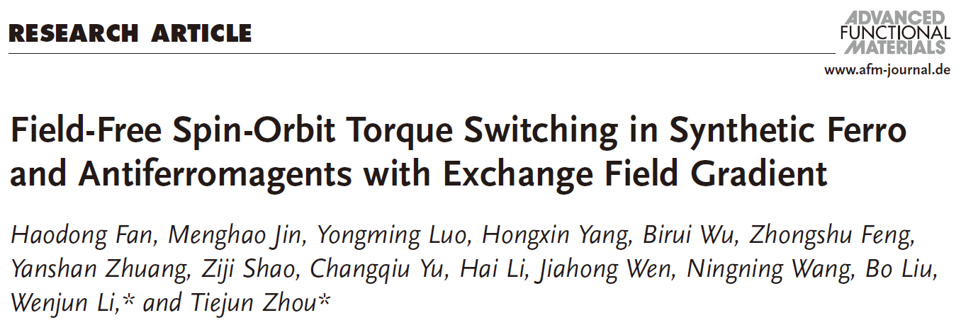 近日,我校电子信息学院磁电子器件与系统团队以久久精品一区二区为第一单位,以封面文章在顶级学术期刊Advanced Functional Materials (SCI 1区Top, 影响因子19.924)上发表研究论文 Field-Free Spin-Orbit Torque Switching in Synthetic Ferro and Antiferromagents with Exchange Field Gradient。电子信息学院博士研究生樊浩东和金蒙豪老师为共同第一作者,我校李文钧教授和周铁军教授为共同通讯作者。樊浩东为李文钧教授和周铁军教授共同指导的博士研究生,目前已发表多篇SCI Top期刊论文,包括ACS Applied Materials & Interfaces, Applied Physics Letters等。