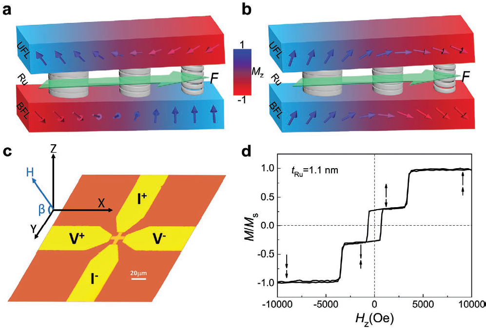 文章根据铁磁层间的耦合场强烈依赖于隔离层Ru的厚度,提出在两个薄铁磁层之间插入轻微楔形Ru(如图1所示),将交换场梯度引入垂直磁化的人工铁磁和反铁磁体中,这使系统产生一个额外的作用力,导致了对称性破缺,实现了垂直磁化的人工铁磁和反铁磁的无磁场磁矩翻转。