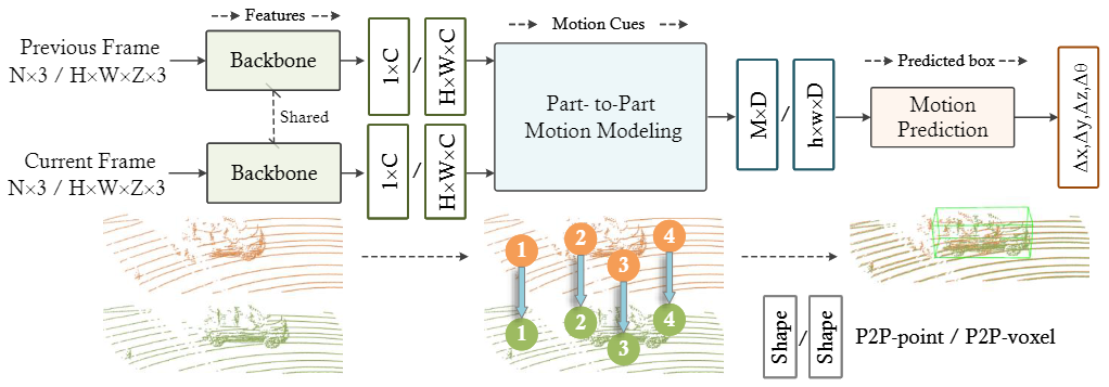 架构:在上述探索结果的基础上,论文设计了一种新颖的“部件对应部件”式细粒度运动建模机制。该方法通过挖掘目标在连续两帧点云中的局部结构变化,实现对目标整体运动趋势的精准建模。不同于传统的刚体或全局中心运动估计方式,本方法强调对目标关键部件之间的对应关系进行细粒度建模,从而提升在复杂场景中对遮挡、形变和多目标干扰下的鲁棒性与准确率。该方法有效结合了结构先验与数据驱动建模,为点云运动建模提供了新的思路。基于这个设计,论文构建了一套通用的点云运动建模框架,如图2所示。